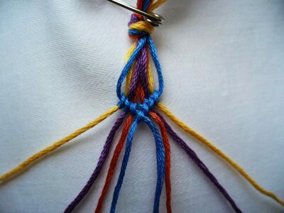Toma el primer hilo de la izquierda (según la foto el azul) y anúdalo con el el segundo hilo de la izquierda (amarillo).